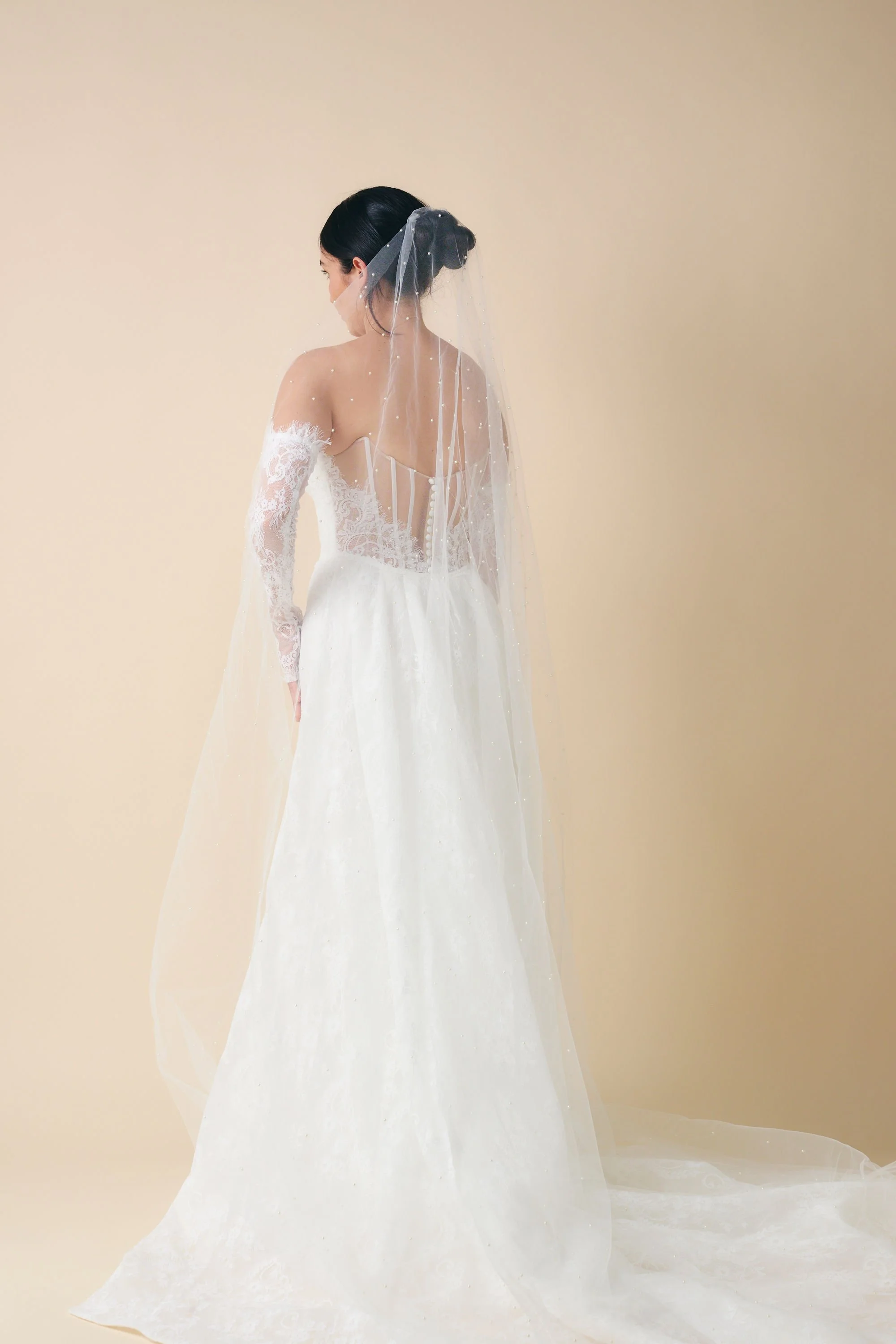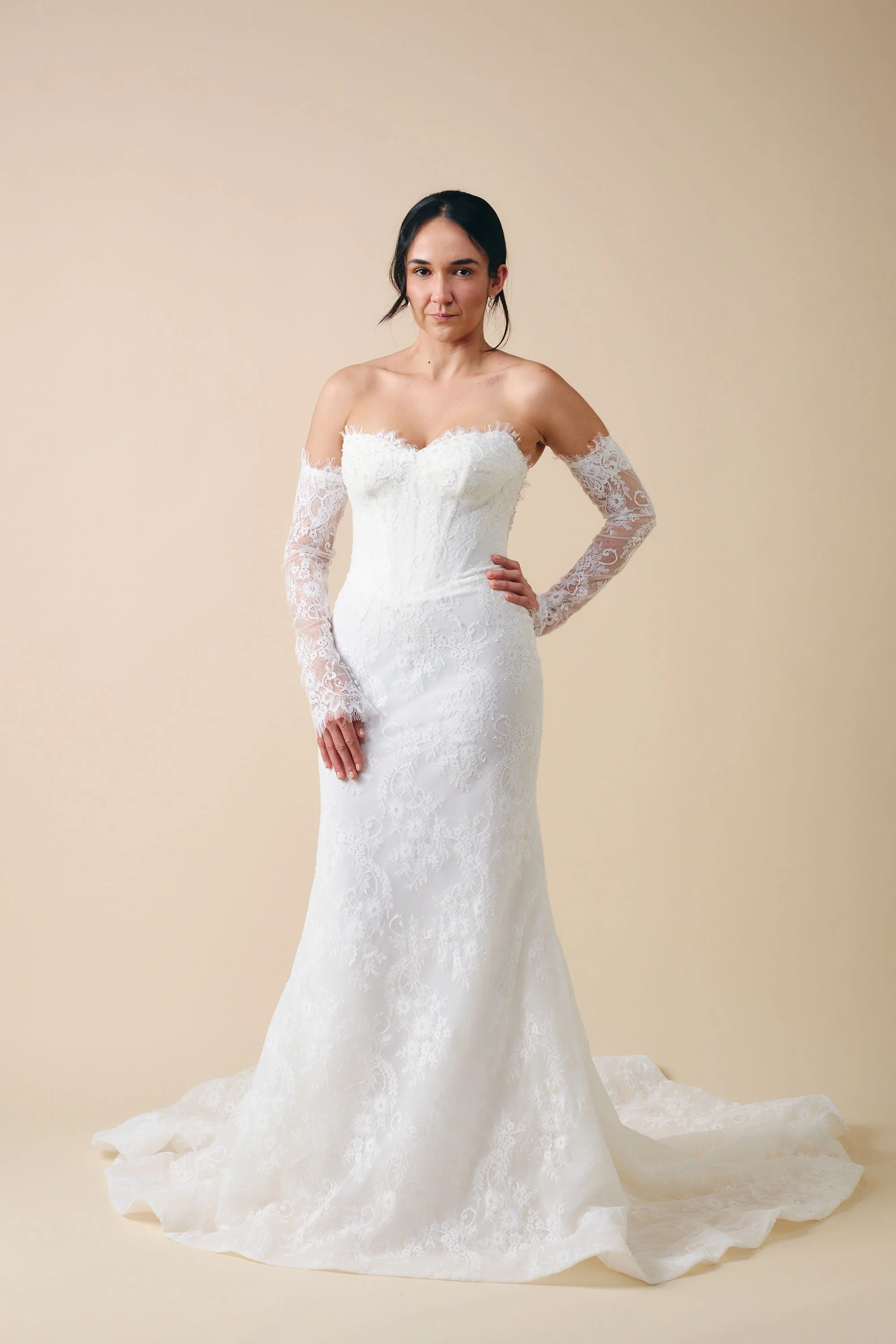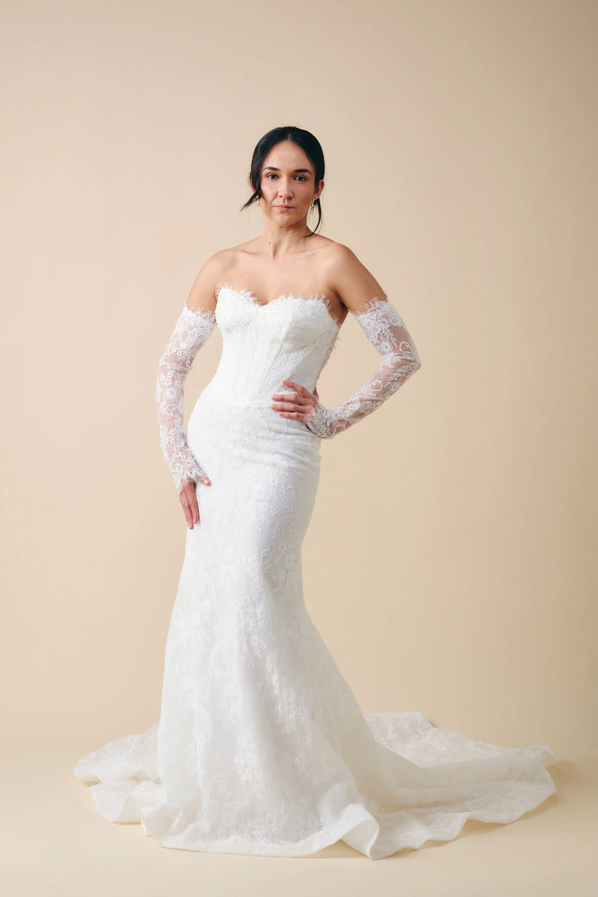 Clara is effortlessly romantic, shaped through a structured bodice and softened by intricate lace.