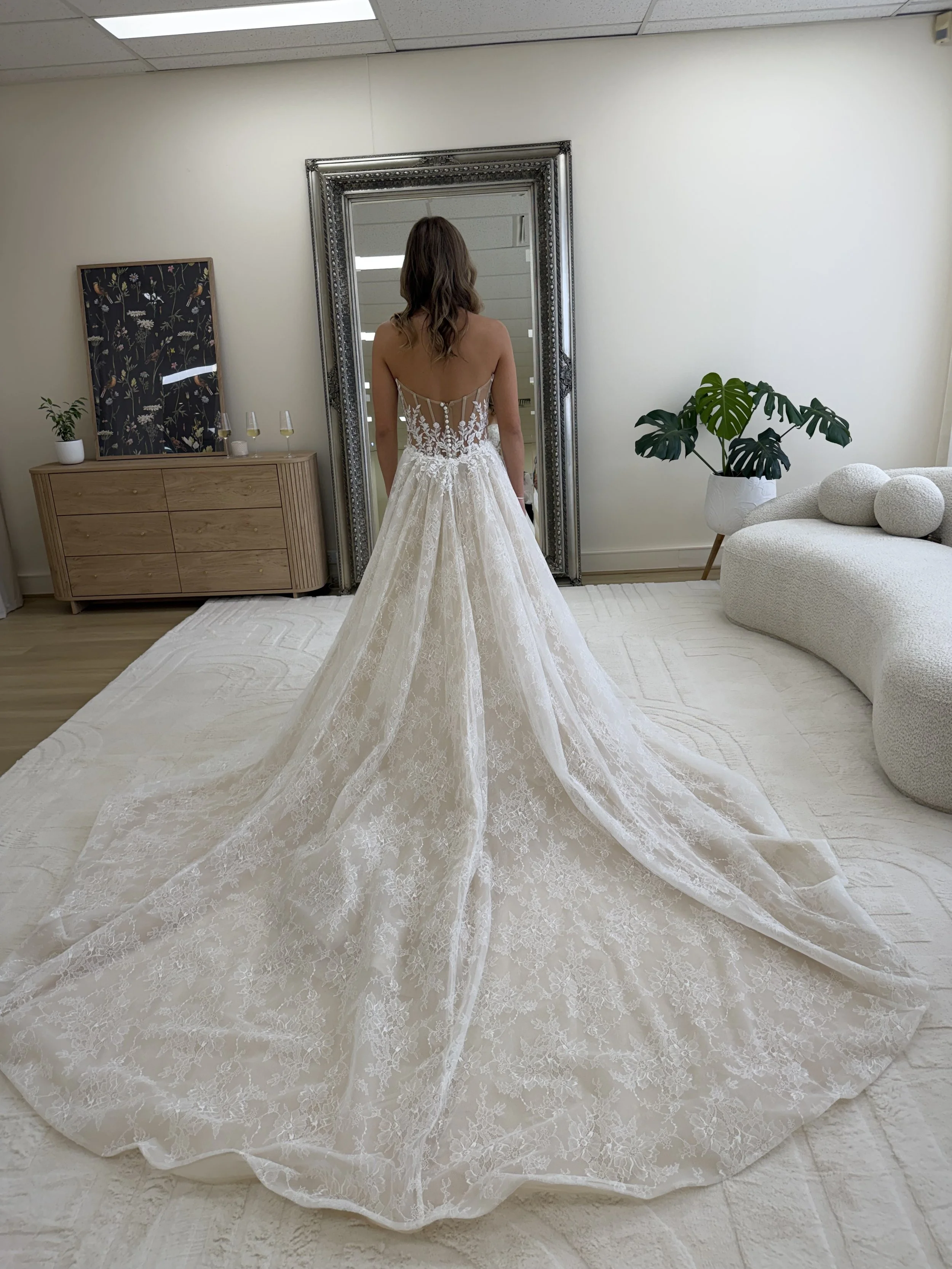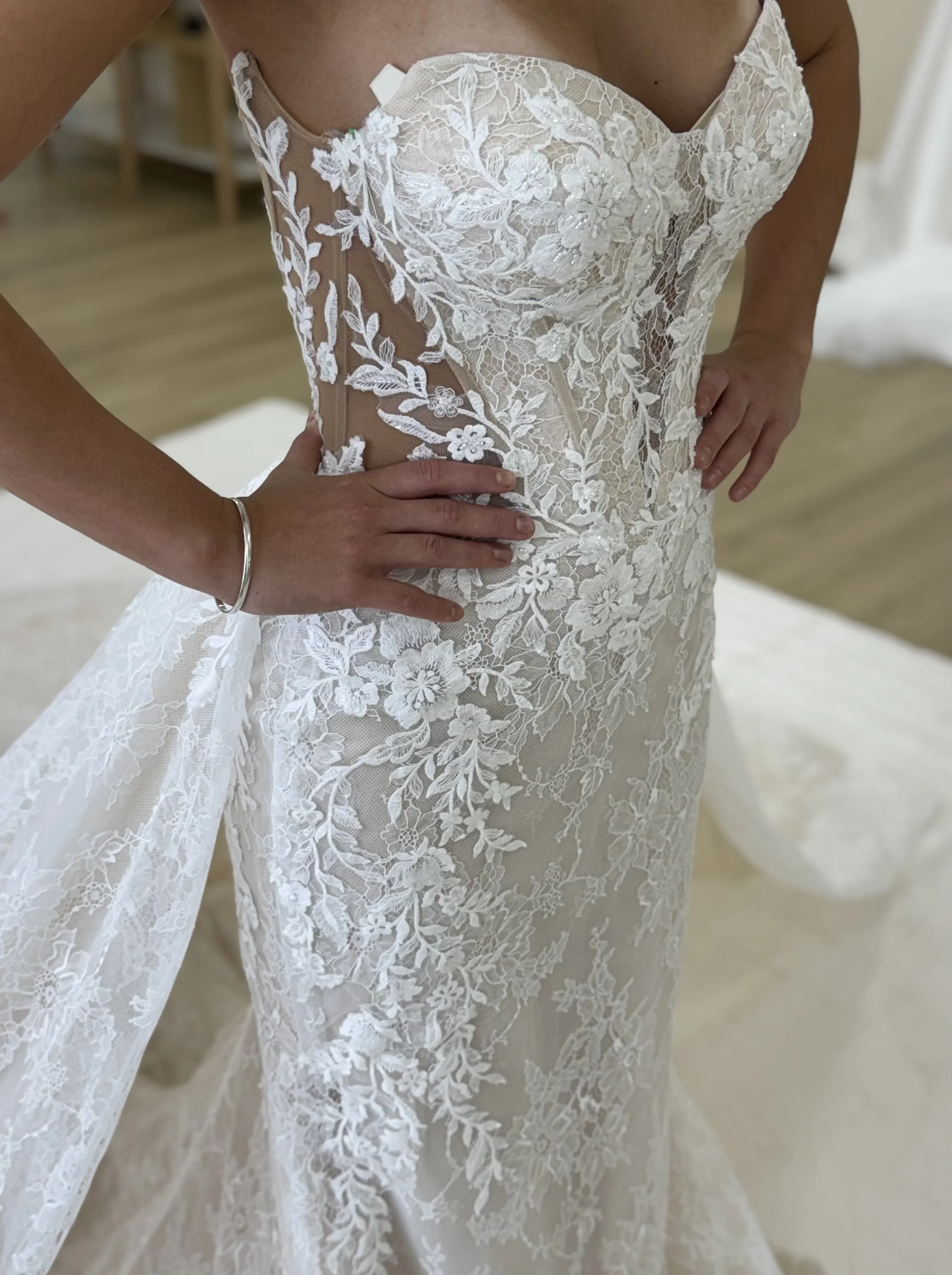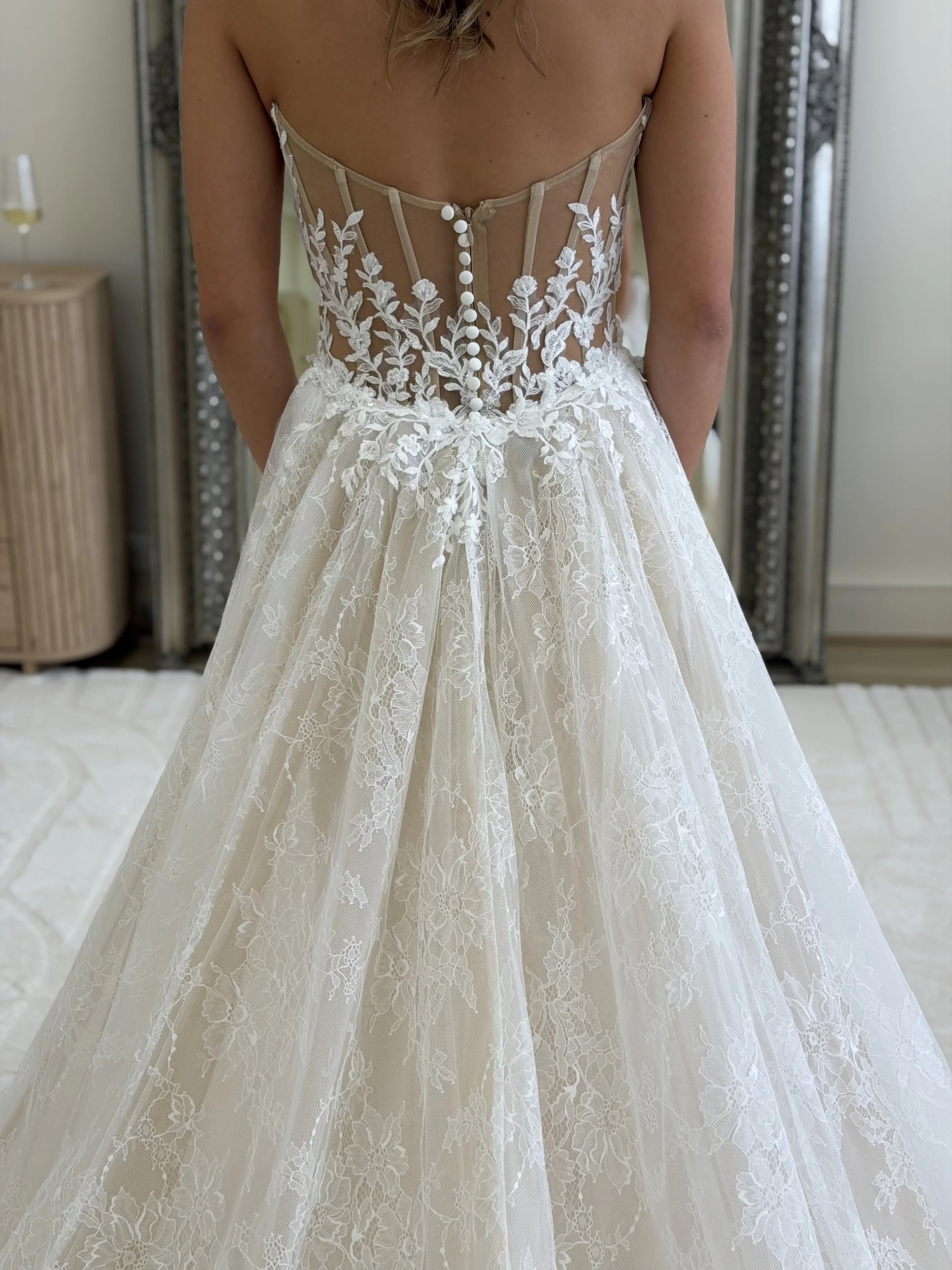 Delicate lace over a sculpted sheer corset bodice flows into a soft, full skirt with a gentle train, finished with a removable overskirt—designed to feel both refined and effortlessly structured